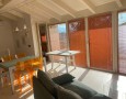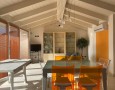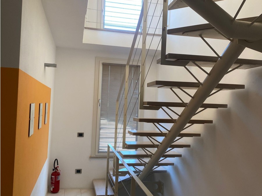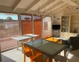 Piano Secondo: Il vero cuore della casa. Un moderno soggiorno openspace con cucina a vista, caratterizzato da alti soffitti con travi bianche a vista e grandi vetrate che inondano l'ambiente di luce naturale. Da qui si accede a una godibile terrazza, perfetta per cene all'aperto o momenti di relax.