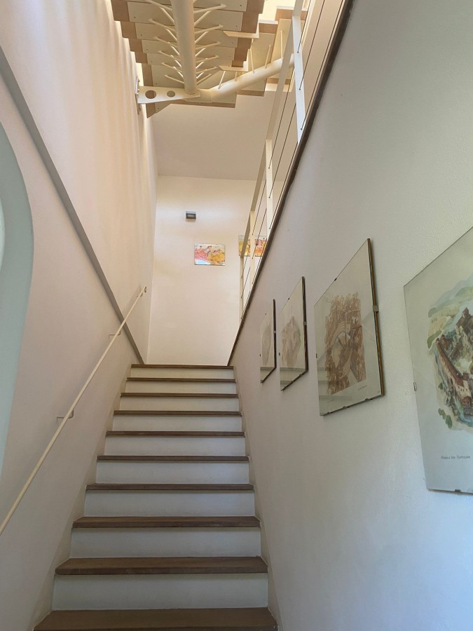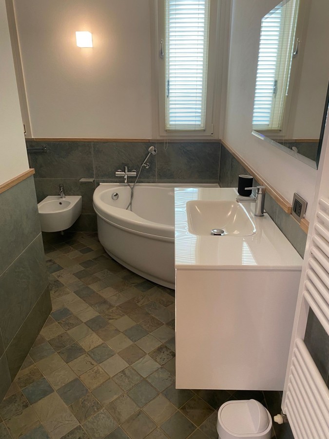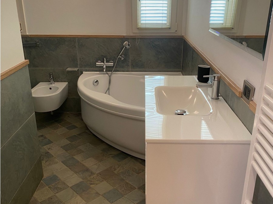 Piano Primo: La zona notte, intima e accogliente, ospita due camere matrimoniali, una cameretta versatile (ideale come studio o stanza ospiti) e un ampio bagno finestrato, dotato di vasca e finiture in pietra.
